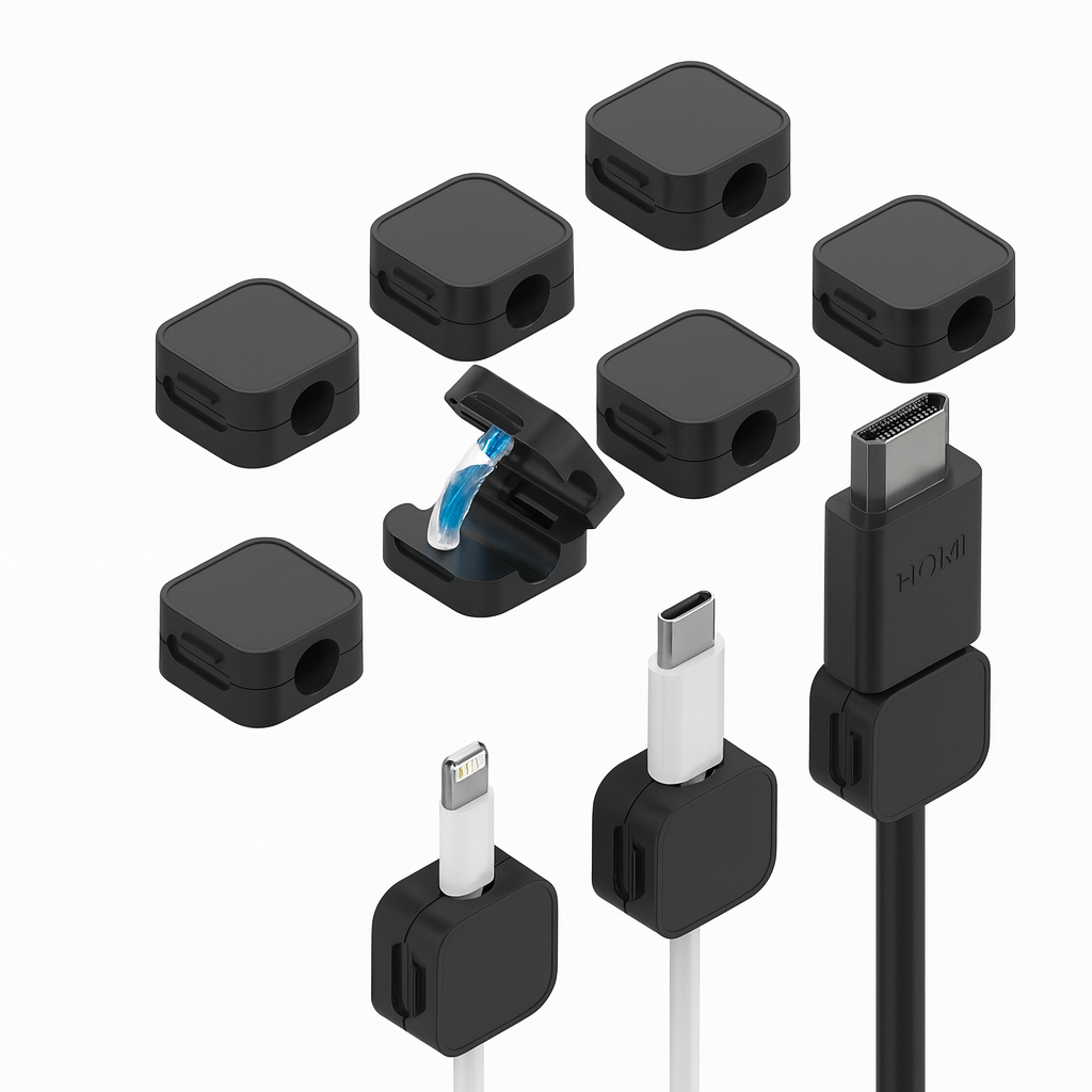 Klipsy posiadają otwór o średnicy 7 mm 🔌, idealnie dopasowany do większości przewodów: ładowarek telefonów, kabli USB, HDMI oraz kabli komputerowych. Stabilnie utrzymują nawet małe wtyczki, takie jak oryginalne ładowarki iPhone 📱, a przewody wysuwają się z nich płynnie – bez zahaczania i szarpania.